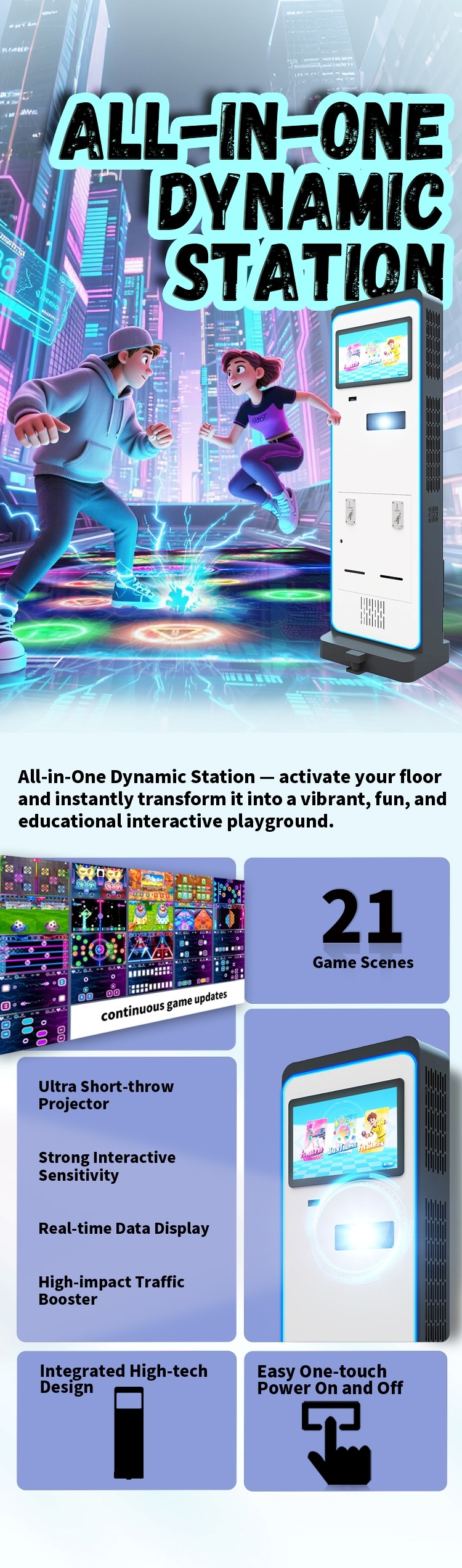This immersive projection playground uses advanced motion sensing technology and large-scale floor projection to transform ordinary venues into dynamic interactive play spaces. By responding instantly to body movements, the system creates an engaging environment where users can jump, run, compete, and learn through visually rich interactive floor games.