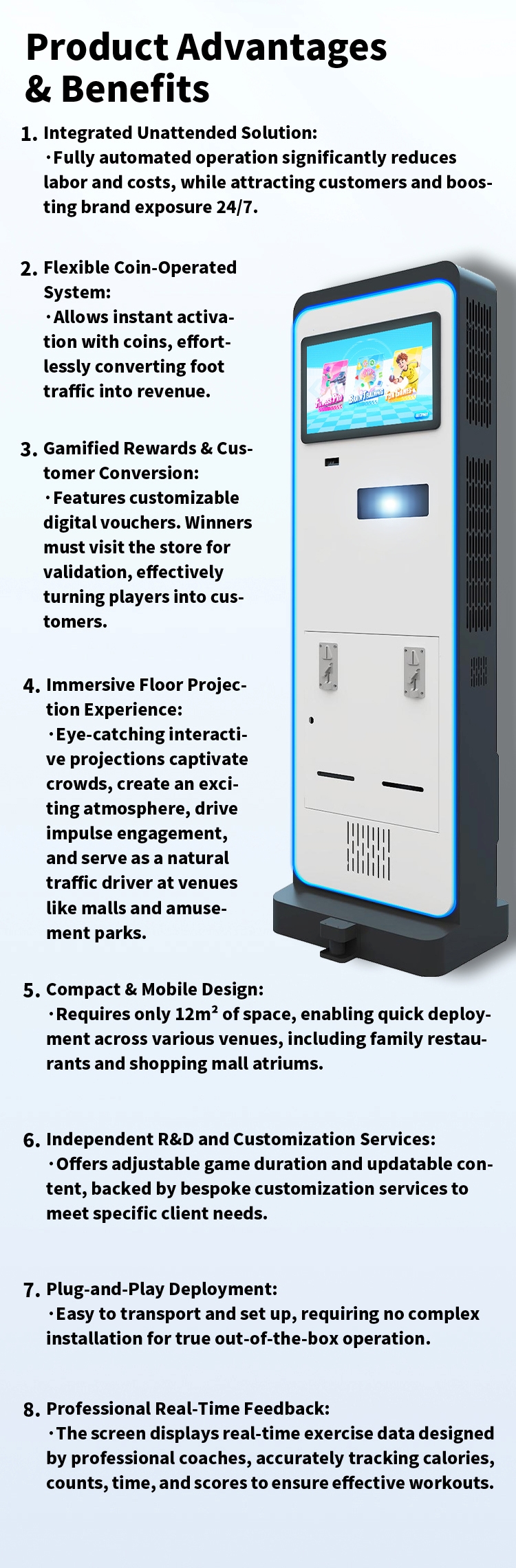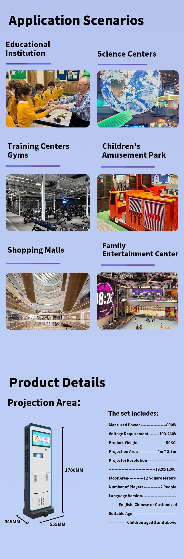 Built as a compact all-in-one solution, the system integrates a high-brightness projector, precision sensors, and intelligent control software into a single unit. It requires only 12 square meters of open floor space and supports fast plug-and-play installation, making it ideal for shopping malls, entertainment centers, 美術館, family venues, and event spaces with flexible layout requirements.